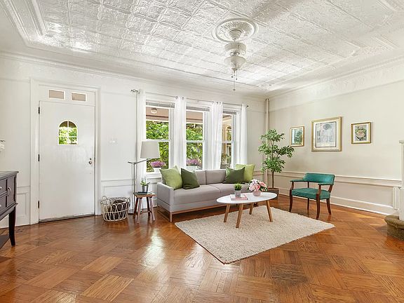 Introducing 348 81st Street - a 3bed/2 bath pre-war brick townhouse with parking for 3 cars, a charming front porch, and a backyard garden and patio. Located on a lovely tree-lined block in prime Bay Ridge, this home is loaded with original details including hardwood parquet floors with inlays, crown moldings, and tin ceilings. The parlor level features a bright and spacious living room, a formal dining room with built-ins, and a sunny, modern kitchen with a window. A mudroom off the kitchen leads to a garden and paved backyard patio that's perfect for entertaining or for relaxing after a long day. The upper level has three bedrooms with treetop views, a modern bathroom, and a skylight that fills the home with natural light. The lower level of the home is unfinished, features two separate entrances, leading to the backyard and the front, has a full bathroom, and houses the mechanicals. Additional features include high ceilings, crown moldings, ceiling medallions, beautiful front garden, a garage, and abundant closet and storage space. Ideally located on a quiet street close to the subway and the shops and restaurants on both 3rd and 5th Avenues and currently zoned for PS185- this home is a must see! Call to schedule your showing today!