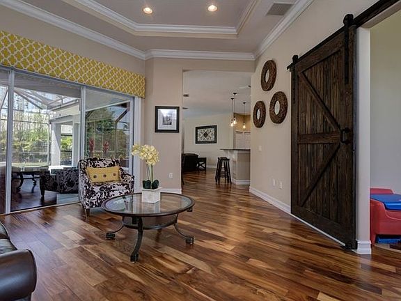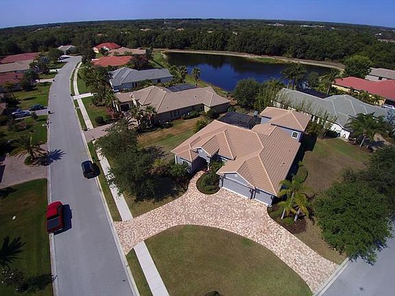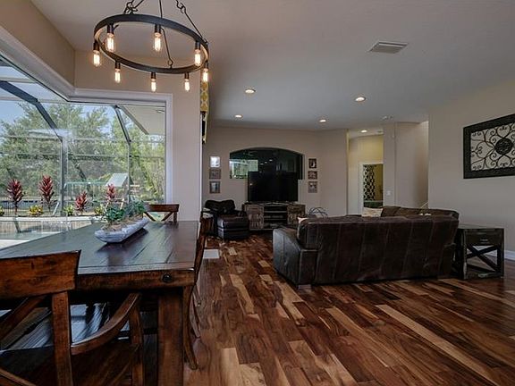 Florida living at its finest in this gorgeous 5 bedroom, 4 bath home situated on a corner lot in desirable Greyhawk Landing. Where else can you play tennis, enjoy the lagoon-style community pool, and workout at the fitness center without leaving the neighborhood? Step inside this home and you will fall in love with the beautiful laminate wood floors and spacious open floor plan. This home includes a formal living room, dining room and a more casual family room that opens to the sparkling screened in pool. 3 sets of pocket sliders line the living, family, and breakfast area allowing for lots of natural light or opened for entertaining or enjoying the gorgeous Florida weather. You will love cooking in the spacious eat-in kitchen accented with wood cabinetry, granite countertops, stainless steel appliances, decorative tile backsplash and a breakfast bar. The generous master suite offers a tray ceiling, access to the lanai and a large en-suite bath with separate vanities, garden tub, and walk-in shower. There are 3 more generous sized bedrooms downstairs perfect for family or guests. Relax outside on the screened lanai with two sitting areas that overlook the pool and large fenced in back yard. Upstairs is a large bonus/bedroom, bathroom, and an outdoor balcony. Other features of this home include an indoor utility room, 3 car garage, mature landscaping, and a paver circular drive. All located in a family friendly, amenity-rich, gated community close to championship golf courses, shopping, and great schools.