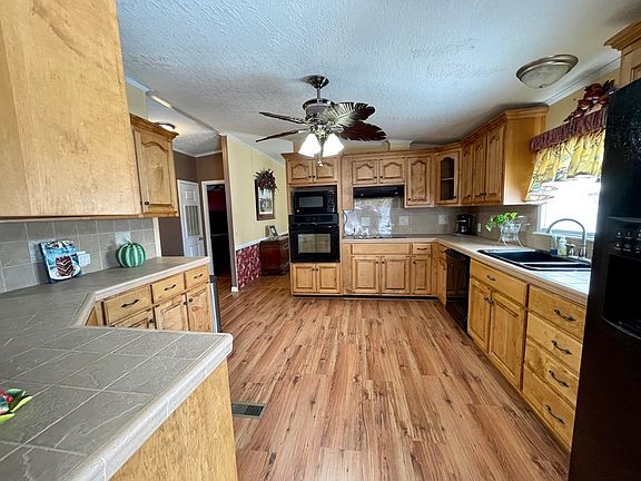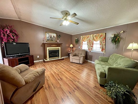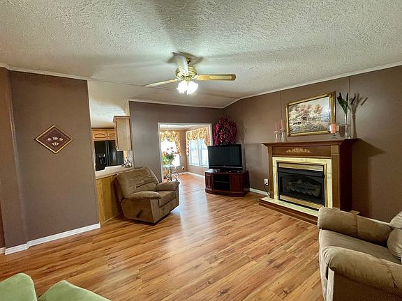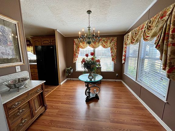 Very nice 3 BR 2 Bath manufactured home on 5 acres features covered front porch and large deck with screened in area and open area perfect for grilling and outdoor entertaining. Large detached garage with separate area being used for wood working shop, and man cave with pool table and light that convey. Metal carport and other small outbuildings. Custom wood cabinets. HVAC 2012.