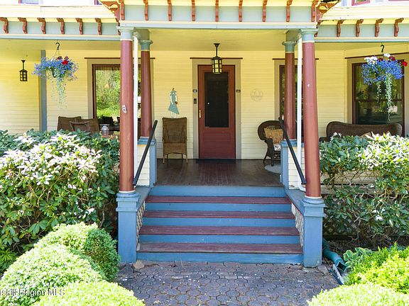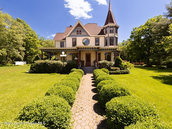 Built circa 1900 this exquisite Queen Anne Victorian home blends historic charm with modern conveniences. Nestled on 1.48 acres in the Catskill Mountain village of Andes this grand lady boasts 5 spacious bedrooms, 5 bathrooms, a inviting foyer and a gourmet kitchen that seamlessly blends the dining room with the sunroom. A welcoming front porch invites you into a meticulously maintained interior featuring many original period details including stained glass windows, hard wood floors, ornate wood work and two fireplaces. The property includes a fully-contained attic apartment, perfect for guests, extended family, or potential rental income. A rec room, gym, sauna and expansive rear deck compliment the serene stream-side setting. With its unique blend of residential comfort and commercial potential, this property is ideal for a home, an inn, wellness retreat, or event space. Additional features include an orchard, extensive landscaping and three-bay garage which provides ample storage and parking. Don't miss this rare opportunity to own a piece of history with modern amenities and residential & commercial possibilities. Minutes to services and located about 2.5 hours to NYC.