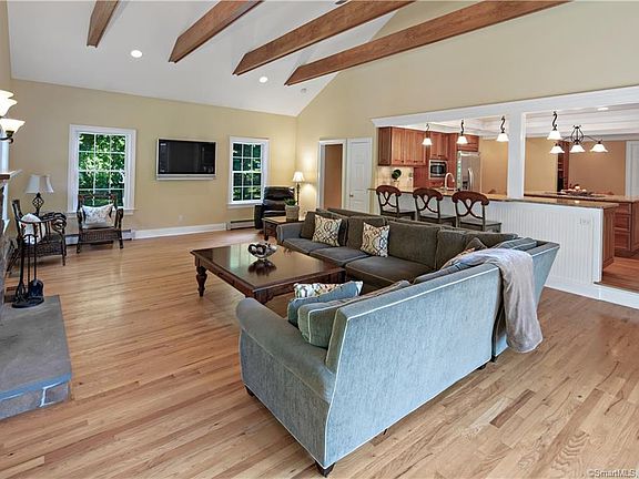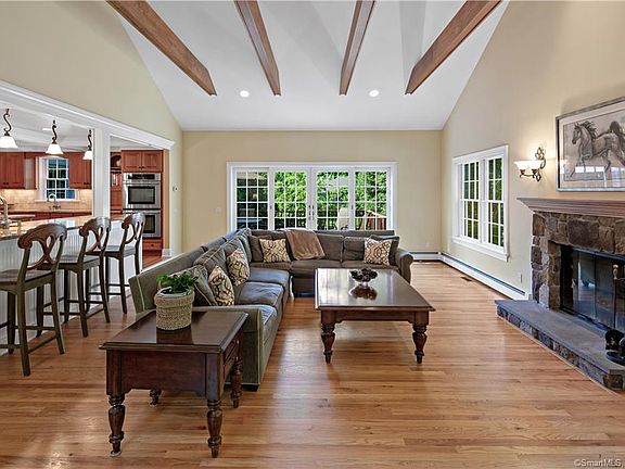 Convenient and surprisingly secluded! Open Concept, a Gourmet Kitchen with double ovens, oversized Family Room with a substantial stone fireplace. The Living Room with a second fireplace looks over the big, luscious backyard with mature trees and a sizable deck. The large windows bring in sunlight to every room in the home. A thoughtfully designed floor plan, two walk in closets upstairs, an updated Master Bath and a huge basement with a walkout to the covered patio. This spectacular home has been remodeled and expanded with superb craftsmanship. A short walk to Darien High School, preschools, mere minutes to shopping, restaurant and nearly endless recreational opportunities. A gem!