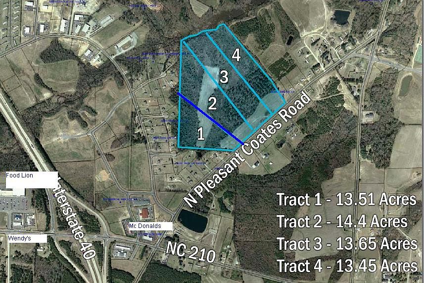 For Sale By Owner 13.51 Ac $249,000 = $249,000.00 $18,430 per ac Only 1/2 mile from I-40 Zoning: IHI 348 N Pleasant Coates Rd - Benson, NC 27504 Zoning (Interstate Highway Interchange) allows for a variety of uses including but not limited to, restaurants, gas stations, grocery stores, hotels, offices, etc. Beautiful piece of land in a prime location with easy access to I-40 and Hwy 210. Very near West Johnston High School. Can also be used for residential. For more information call David at 919-612-5531