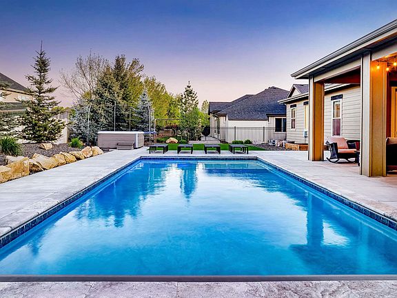 Custom built residence in Timberland Estates centrally located in the heart of Eagle. No detail was left untouched in this ~3371sqft, 5-bed + bonus, 3-bath home featuring designer finishes & unparalleled quality. Open concept great room w/ East facing picture windows overlooking the sport pool & lush landscaping. Key elements include hand-scraped engineered hardwood floors, gas fireplace & upgraded lighting throughout. Chef’s kitchen w/ central island, quartz counters, under-cabinet lighting, gas range & double ovens. Spacious butler’s pantry w/ appliance station. Main level primary suite w/ luxurious en-suite bath, walk-in closet + 9’x9’ flex space or future pool bathroom. Main level guest suite w/ full bath. Upper level bonus room, 3 bedrooms & full bath w/ dual vanity. Enjoy summers w/ an expansive covered patio, heated pool & tranquil water feature. Fully fenced yard w/ synthetic lawn & low-cost irrigation water. Dream 4+ car garage w/ ~13.5’x42’ RV bay. Minutes to area schools, restaurants & downtown.