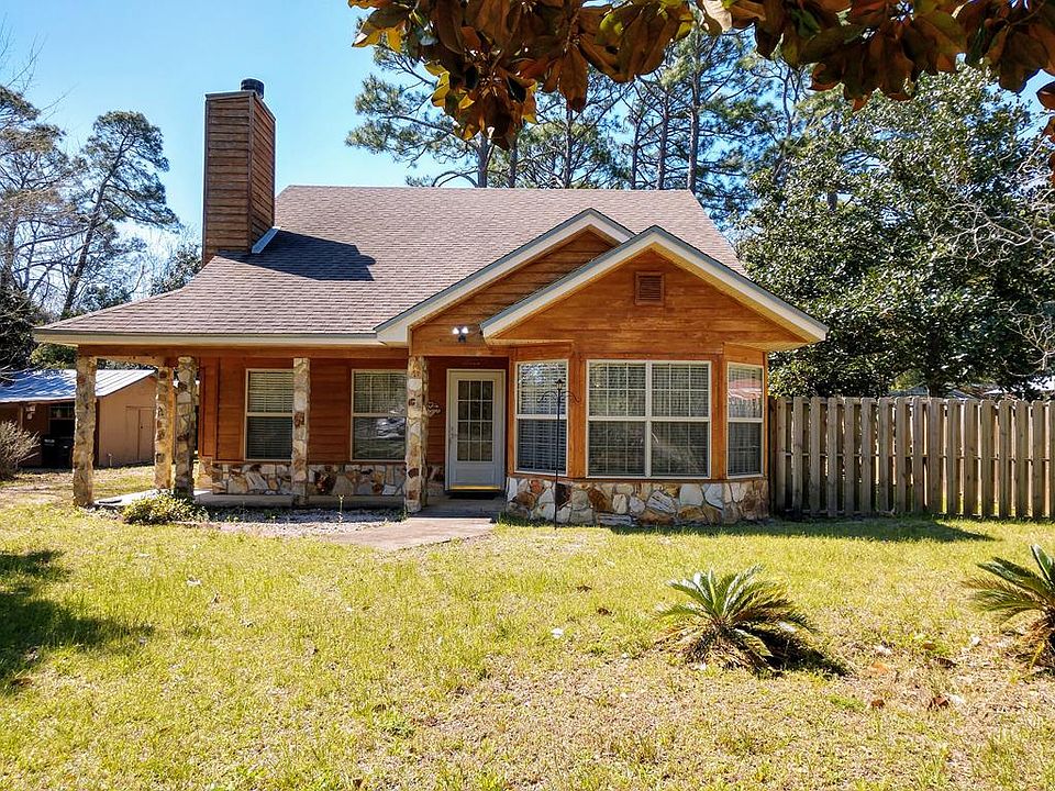 This 3 bedroom, 2.5 bath home on over a 1/2 acre is in a premier location close to downtown Eastpoint and a short drive to the beach. Once inside this home, you can't miss the beautiful floor to ceiling stone fireplace & vaulted ceiling accenting the living area. The kitchen features a stainless steel refrigerator & stove with ample cabinets and cooking space. The master bedroom is on the first level with attached bath w/ double vanity & garden tub. French doors lead to a covered sitting area, The open staircase takes you to the second level and two additional bedrooms and full bath, one bedroom has a balcony. Spend your Sunday afternoons entertaining in the large L shaped yard which is completely fenced in with an electric gate. There is a separate workshop with water, electric, carport and pole barn. This rustic charmer is a must-see!