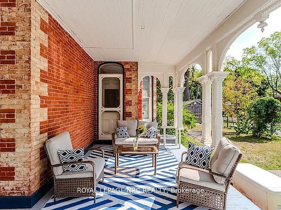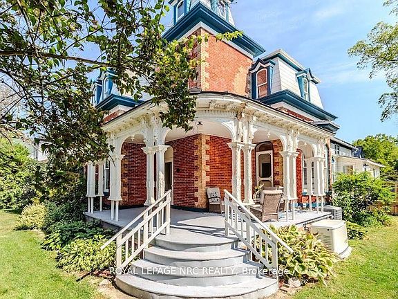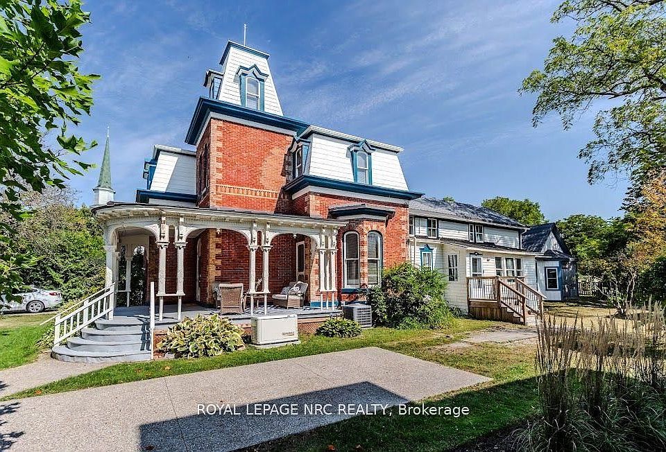 Located in the charming village of Ridgeway, 348 Ridge Road North offers a rare opportunity to own a historic gem. Built in the 1880s, this Second Empire-style home features a striking mansard roof and decorative dormers, blending timeless architecture with modern comfort. With over 2,800 square feet, the home offers six bedrooms and 2.5 bathrooms, including a main-floor primary bedroom and an updated main-floor bathroom with custom shower. The west-facing porch is the perfect place to relax and take in beautiful sunset views.Inside, original character details are thoughtfully paired with modern updates. The main floor features two parlours, a formal dining room, and a secondary dining area, ideal for everyday living or entertaining. High ceilings, large windows, original wood staircases, detailed trim, and two gas fireplaces-one with its original mantle-enhance the home's historic appeal. The renovated kitchen includes custom cabinetry, quartz countertops, and a copper sink, while central air ensures year-round comfort. Upstairs, five additional bedrooms and another 1.5-bath layout provide flexible space for family, guests, or a home office. Fresh paint and restored floors brighten many rooms throughout. Outside, a private rear deck, garden, and orchard create a welcoming space for entertaining, complemented by a workshop and ample storage. Recent updates include a concrete driveway, natural gas generator, and metal roof. Buyers are encouraged to verify permitted uses and zoning. Located in walkable downtown Ridgeway, this home is close to shops, dining, and community events, with the shores of Lake Erie just a short drive away-offering the perfect blend of small-town charm and lakeside living.