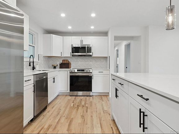 The home features open floor plan living space with real hardwood floors, large kitchen - with brand new cabinets, quartz countertops, modern backsplash, new stainless steel appliances, large single basin sink and an oversized peninsula featuring a waterfall edge.
