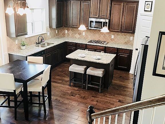 - RoomKitchenFeatures: Granite Counters, Kitchen Island, Pantry, Recessed Lighting, Eat-in Kitchen, Floors-Hardwood, Cabinets-Stained, Bar, Backsplash-Tiled