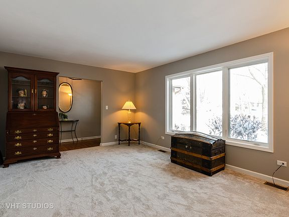 Sprawling brick front ranch with 4 bedrooms & full finished basement. 3+ car garage - 2 1/2 car in front...1 1/2 car attached behind the house with heat and A/C (makes a great workshop). Separate furnace for garages. Recently updated and ready for you to move in and enjoy. Loads of oak cabinets in the country sized kitchen with new granite counters and subway tile back splash. Large dining area with sliders to patio and fully fenced yard. Cozy family room with stacked stone fireplace - mounted TV included. Master bedroom with private bath. Awesome finished basement with exposed ceilings. The open flow of the rec room makes for easy entertaining for a large crowd. Custom built wet bar with hutch...two areas for laundry on main floor or basement. A parking pad to the right of the garage...need to park your boat, RV, etc. Freshly painted, Updates include new carpeting, light fixtures, bathroom remodel, and much more. Convenient country setting!! Minutes to I-90 & Metra.