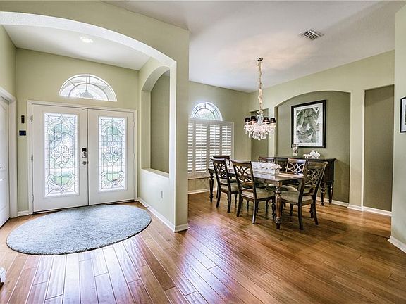 Enjoy Lake Bernadette at its finest with this 5 bedroom, 3 baths, bonus room, and 3 car garage home! This beautiful pool home sits on conservation with the golf course 12th hole behind it. Walk through the double front doors and your greeted with shining teak wood floors which are also water proof. The 5th bedroom which is currently being used as an office is privately located at the front of the home along with the formal dining & living room. Master bedroom is split from all other bedrooms with sliding doors going out to the covered screened lanai. Master bath features dual sinks, garden tub with separate shower, and water closet. The kitchen & breakfast nook open up to the great room and both have a tranquil view of the sparkling pool! Kitchen features stainless steel appliances, granite countertops, island, tons of cabinets for storage, closet pantry and counter height breakfast bar. Two oversized bedrooms down one hallway that share a bath. And 4th bedroom with bath are connected to the bonus room and could be considered an in-law suite. Bonus room also has sliders that lead out to the pool. There are so many more wonderful features like custom curtains, plantation shutters, and propane heated pool with a fountain water features and lights. Lake Bernadette offers a resort style pool, clubhouse, fitness center, tennis court, and public golf.
