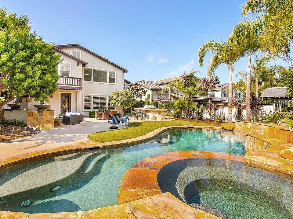 Enjoy the year-round San Diego summers from your tropical backyard with an inviting pool & spa, built-in BBQ, outdoor fireplace, and plenty of room to entertain. This beautiful La Costa home has everything you need from 4 bedrooms with a bonus room and additional loft, to beautiful new floors, an updated kitchen, large laundry room, spacious family room, and formal living and dining rooms. Nestled on a quiet cul-de-sac in La Costa's Santa Fe Trails community with AC, a 3-car garage, & blocks to top schools. Min 12 month lease $5,900/mo. No smoking. Patio and loft come furnished. Single dog may be considered with restrictions.