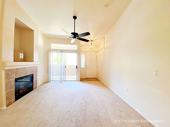 This home features a comfortable mix of carpet and tile flooring throughout. The primary bedroom is separate from the other two for added privacy. The eat-in kitchen includes stainless steel appliances, and all appliances are provided. Ceiling fans are installed for comfort, and the home is located in a gated community offering great amenities such as a fitness center, pool, and spa.