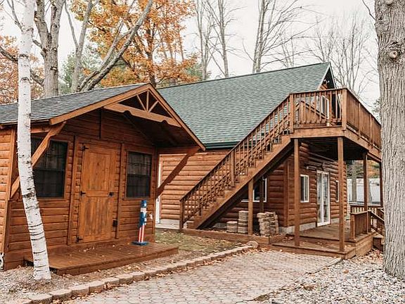 You will want to see this northern retreat! everything is in excellent condition and very well maintained, there is fresh stain on the decking and exterior of home, cabin and garage. This can be sold basically turn key so just pack your bags and enjoy all the thousands of acres of state land until we get our lake back. The home is adorable and has a separate bonus 12x12 cabin that is sleeping quarters or a hang out. plus the loft above the garage that is finished into sleeping quarters also. Enjoy the bon fires on a circle paved slab, pavers between the home and garage. This home includes the vacant lot across the road. Come take a look at this unique property with a board walk and nice seawall, garage has slider to go outside, pool table included and some tables and chairs in the garage.