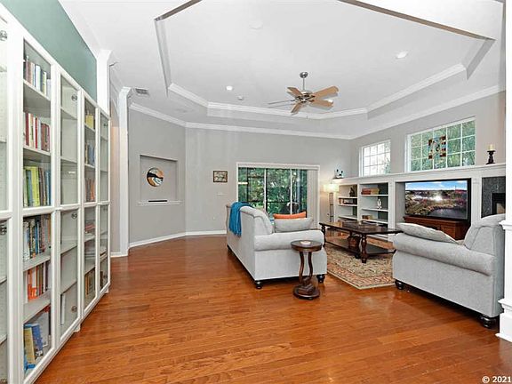 Welcome to Garison Way! An elegant green neighborhood of well-designed homes built by the reputable G. W. Robinson. This 4 bed, 3 bath house of 2135 sqft rests luxuriously on a .18 acre lot. The open concept living area boasts beautiful built-in shelves and a substantial gas fireplace. Tray ceilings and columns complete the common area with an air of style and sophistication. The sliding glass door opens completely between the living room and the outside screened area, perfect when entertaining. The palatial master suite features a tray ceiling in the bedroom as well, and spa tub and dual sinks in the bathroom. Detailed crown molding offers the perfect touch of distinction throughout the house. The new washer and dryer in the utility room are included. Built-in cabinets in the garage offer plenty of organizational space for all of your storage needs. The HOA covers landscaping, exterior maintenance and access to a beautiful community pool and dog park. You'll appreciate the short drive to Celebration Point, I-75 and many of Gainesville's favorite eateries and shopping.