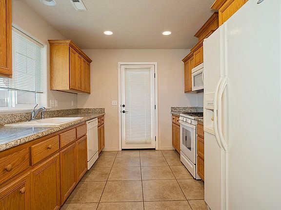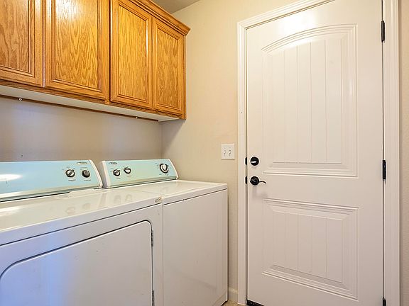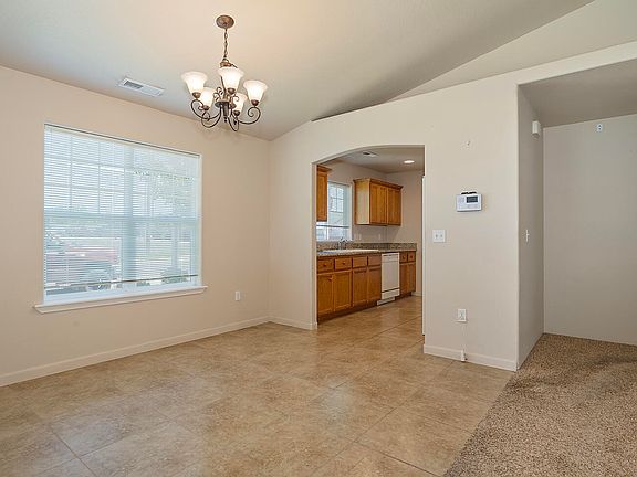 Built with tall vaulted ceilings this open floor plan invites you right in. Extra large tile floors and granite countertops in the kitchen with crown molding above the kitchen cabinets make for a beautiful and functional kitchen and dining area. The house has plenty of storage space, including upper cabinets in the laundry room.