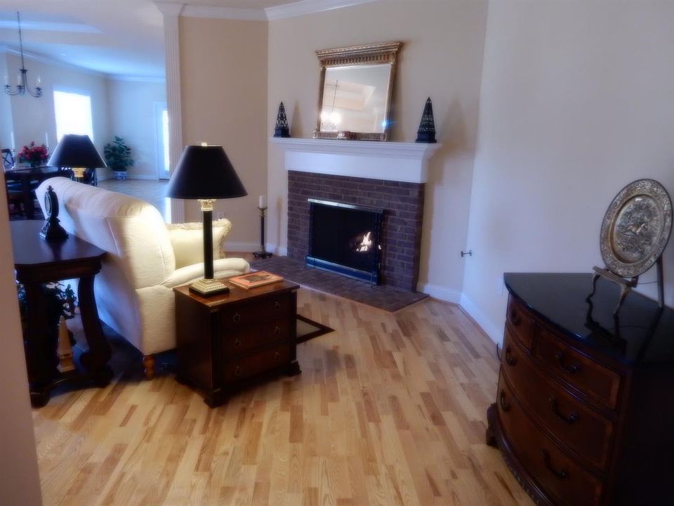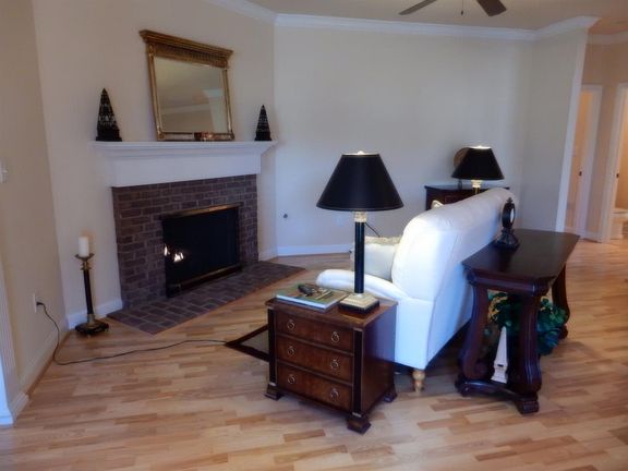 This lovely, well maintained condo is located in the back of the Village away from road noise and is move-in ready. Fine interior features: 9 ft ceilings, masonry fireplace w/gas logs, wood flooring throughout, dining area with tray ceiling, sound system, Gemini security system, staggered kitchen cabinetry and screened-in patio. The MBR bath has tiled walk-in shower and soaking tub. Come enjoy this maintenance free lifestyle community!