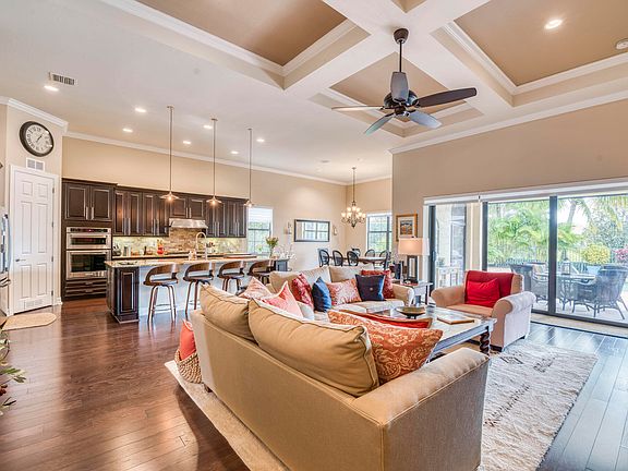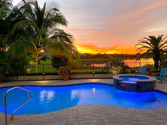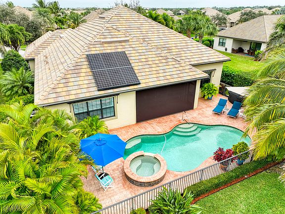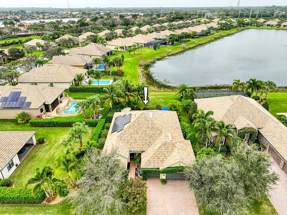 Welcome to this exquisite Lakefront 3BR/3BA + Den, large 3 car garage, DiVosta DartmouthEstate Series model Home, boasts high-end finishes and Upgrades, Hi-Impact windows and Doors, w/heated Saltwater Pool and Spa, and a fully paid 25-year transferable warranty Solar & Battery backup system. Located in the highly desirable community of Castellina in Wellington, it's walking distance to Whole Foods, Trader Joe's, many restaurants, and minutes' drive to the world-renowned Equestrian and Polo Center. As you enter this home, you are greeted in a large foyer, gleaming wood floors, gorgeous view of the pool and lake, elevated ceilings, custom 8ft doors, open concept, creating a luxury living experience. The upgraded chef's kitchen features high-end appliance appliances, Gas Cooktop, luxurious dark wood soft-close cabinetry, granite countertops, a huge center island with pendant lighting, bar seating, a walk-in pantry with custom shelving and AC Chilled wine rack. Through the triple sliding doors from the great room, there is a covered Patio w/retractable screen that brings together the inside and outside pool deck for entertaining family and friends. Enjoy the tranquil pool and lake view from the oversized primary suite and the ensuite with an