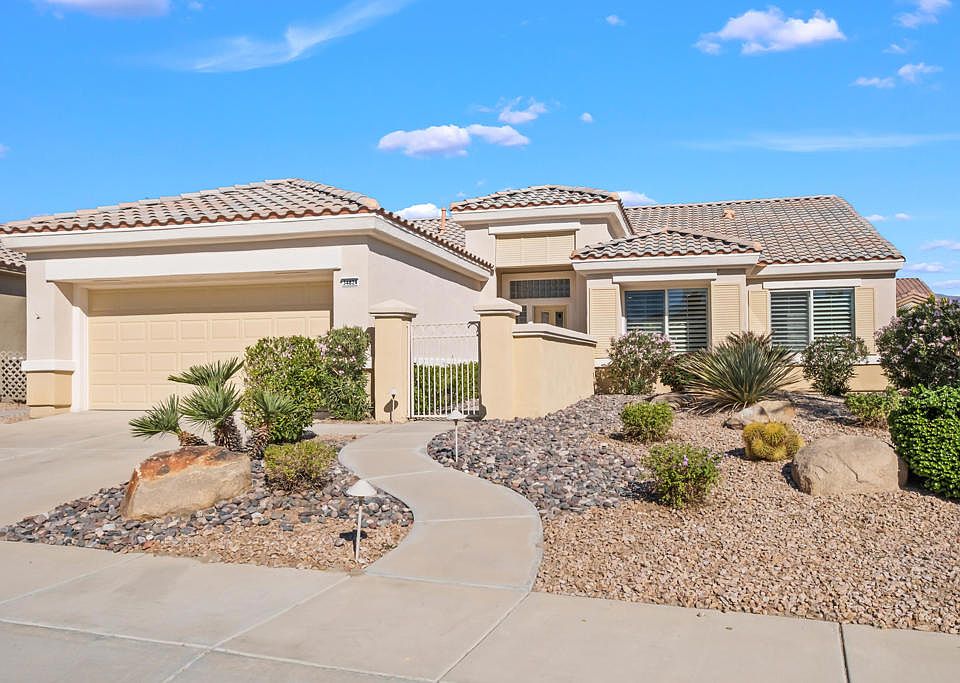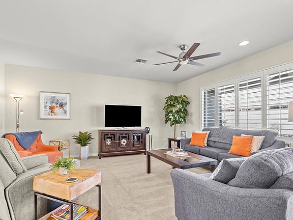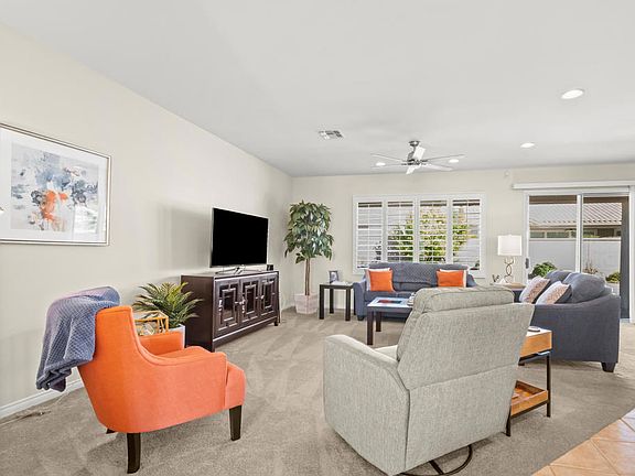 Discover 34824 Staccato Street, a METICULOUSLY updated home built in 2003 on a spacious7,841 sq ft lot, the MONTEGO Plan features 2 bedrooms, 2 baths & versatile DEN. Recently refreshed with new paint & Plantation shutters, this home shines with modern comfort.Key UPDATES include new carpet, bathroom light fixtures, appliances, toilets, water heater,washer & dryer for a move-in ready experience.The kitchen boasts EXTENDED cabinetry & deskarea, while the garage has built-ins & workbench. FURNITURE is available for purchase per inventory list in DOCUMENTS making this an opportunity for an EFFORTLESS transition into your new home. Outside, the pleasing curb appeal is highlighted by established landscaping, a meanderingconcrete pathway leads from the front yard to an alluring hardscaped backyard complete with agas grill hook-up for easy outdoor living.This home is located in the North part of Sun City Palm Desert close to the 3rd clubhouse and North entrance.Sun City Palm Desert 55+ Community offers 2 championship golf courses, 3 clubhouses, fitnesscenters, sporting options & much more. Sports include tennis, pickle ball & billiards. Culinary delights await at the community's two in-house restaurants, & a vibrant social calendar is guaranteed with over 90active clubs to choose from. Buyer to pay one-time HOA Reserve Replenishment Assessment equal to 6 mos. HOA dues, approx. $2377 & can be paid over 9 months.