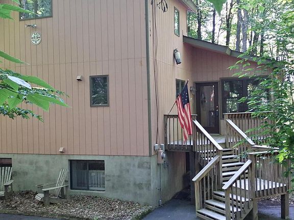 Stroll in and slip off your shoes to a welcoming, oversized four-season room with windows galore offering abundant natural light. Two floors of contemporary country living offer master bedroom suite, an additional bedroom and bathroom, as well as an open floor plan, hardwood floors throughout, and vaulted ceilings. Also included are dining room, living room with pellet stove, modern kitchen with ample cabinet space with corian countertops and an island for casual dining or breakfast on the go. Large open loft invites your imagination. As if this were not enough, finished walk-out lower level features ample living area with propane heater, two bedrooms, full bathroom and utility. This almost 2500 sq ft home is nestled within The Hideout, a four-season community. A definite MUST SEE!!