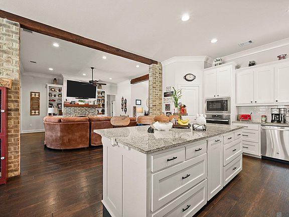 Looking for the perfect place to call home? You just found it! This stunning property blends modern comfort with farmhouse charm, offering custom details throughout that make it truly one of a kind. Step inside and fall in love with the inviting open layout accented by antique wood beams and a striking interior brick wall. The spacious living room features a brick ventless gas fireplace with a shiplap accent wall and remote control—creating the perfect cozy centerpiece. A sliding barn door provides privacy to the secondary bedrooms in this well-designed triple-split floor plan. The gourmet kitchen is a showstopper, complete with a large granite island offering extra storage, custom cabinetry, upgraded stainless appliances, a custom vent hood, high ceilings, and a walk-in corner pantry. Each of the three bedrooms features granite countertops, while the luxurious primary suite includes a spa-like bathroom with a custom tiled shower, large soaking tub, and dual vanities. The spacious walk-in closet features custom built-ins, and the laundry room is conveniently located just off the master bath. Outside, enjoy the ultimate entertaining space with a 16x30 fiberglass saltwater pool, complete with three fountains for extra fun and relaxation. The backyard is fully fenced, offering plenty of additional yard space for pets or play. Added perks include a whole-home Generac 22KW generator, gutters, and front culverts for improved curb appeal. This home truly has it all—style, comfort, and thoughtful upgrades throughout. Don’t wait to make it yours—schedule your private showing today! *Structure square footage nor lot dimensions warranted by Realtor.