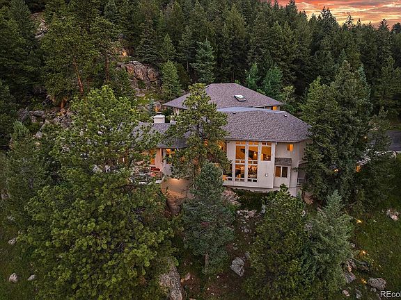 Artfully engineered against a bouldered hillside and overlooking a quiet, tucked away mountain valley, this admirable estate has never been offered for sale. Custom designed in form and fit, the grand contemporary elements of this home meld into its natural setting offering pleasing views of nature and abundant wildlife from every room. Entering the home from across an elevated walkway, your guests are greeted by a grand and welcoming great room with suitably grand stairway inviting you to explore further. Each thoughtful aspect of the architecture draws you into this retreat. The splendid original finish and craftsmanship has been updated by the owners in key areas, bringing the visionary architect’s imagination forward. Your initial tour of the home will challenge you to choose a favorite room or view, that is until you arrive at the primary suite. Awaiting you at the crest of this artistic masterpiece, a spa-like primary retreat indulges you with comfort and luxury. Only 5 minutes to groceries, shops, and restaurants, but you will feel a world away. 35 minutes to Downtown Denver, 45 to Denver International Airport, about 45 minutes to Colorado's world class ski resorts such as Loveland, Breckenridge, Keystone, Breckenridge, Copper, and Arapahoe Basin. Adjacent 17+ acres available that includes the castle kopje rock formation adjacent to this property, MLS# 4001143. Don't miss the virtual tour with more photos, floorplan, aerial & walkthrough video: https://qrco.de/be9sHs. Come and see this special property today!