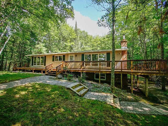 DEERSKIN LAKE DREAM HOME - This well maintained 3BR/2BA home with 120' of Northwest-facing frontage on the clear and beautiful Deerskin Lake and must be seen to be believed! The home has open concept living-dining-kitchen areas on both levels (easily accommodating both quiet and party spaces), main-level bedrooms, cathedral ceilings, 2 fireplaces (including a fieldstone), a walk-out finished lower level with a huge recreation room, a recently-stained wrap around deck, patio with brick walkways, cedar closets, a Kinetico water care system, central air on the main level, and an energy-efficient gas furnace that heats both levels. There is an over-sized 3-car garage that is ready to store all your recreational vehicles. Other features include an asphalt driveway, landscaping, a sun-drenched pier, loon calls, lake stairs with landings and benches, and wooded privacy. Downtown Eagle River is just a short drive away. Make this your new permanent, vacation or future retirement home today!