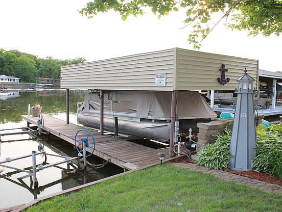 DON'T MISS OUT ON THIS 3 BEDROOM 1 1/2 BATH YEAR ROUND OR SUMMER LAKE HOME. INTERIOR OFFERS NEW CARPET, UPDATED KITCHEN. LIVING ROOM, AND BATHROOM'S, STONE FIREPLACE, NEWER WINDOWS WITH PLANTATION SHUTTERS. LOWER LEVEL OFFERS A SPACIOUS FAMILY ROOM OR COULD BE USED FOR EXTRA SLEEPING FOR GUEST. ENJOY ENTERTAINING OR THE VIEW FROM YOUR MAINTENANCE FREE DECK FEATURING A PERGOLA AND A BUILT IN GRILL AND YOUR VERY OWN PIZZA OVEN. LAKE LEVEL LOT WITH 50' WATERFRONT , STEEL SEAWALL, PERMANENT COVERED ELECTRIC BOAT LIFT, PADDLE BOAT WITH LIFT, NICELY LANDSCAPED YARD , 2+ ATTACHED HEATED GARAGE, 10 X 20 SHED WITH LOFT FOR EXTRA STORAGE. KITCHEN ISLAND WILL STAY ALONG WITH THE TWO TWIN BEDS IN THE LOWER LEVEL.