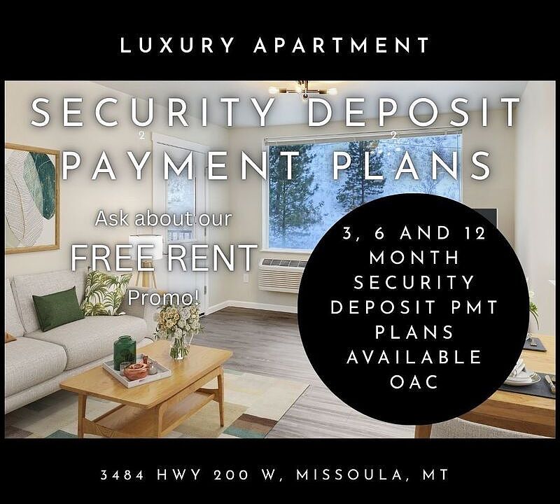 Spacious ground level 2 bedroom / 2 bathroom - The Mount Jumbo Floorplan RENT REDCUTIONS!! FALL SPECIAL! OCTOBER RENT FOR FREE! This property is available NOW, lock in this rent rate through July 14, 2026. We do not hold vacant units, rent begins when the property is rent ready. Reducing Barriers, Opening Doors: Rent Smart Property Management is proud to be the first PM in Missoula offering the renter community a reduced barrier of entry in securing your next home. We have partnered up with a 3rd party vendor who offers 3, 6, 9 or 12 month payment plans on your security deposit. Secure your new home with a fraction of the move in fees! Upon application approval and acceptance of our lease terms, you will be sent a link to qualify for your payment terms. * Payments are made online directly to the vendor who will hold your deposit through the term of your lease and refund your balance due after you vacate in accordance with the MRLTA. The Canyon Lofts Apartments were completed in the Fall of 2022. These gorgeous apartments feature stainless steel appliances, luxury vinyl plank flooring, patios for ground floor apartments and balconies for upper level apartments. Upper level apartments are accessed via stairs on the elevator. Features include: - 2 Bedroom / 2 bathroom - Apt #1 is Handicapped Accessible - Main level apartment - Dishwasher, flat top stove - W/D provided - Laminate flooring, upgraded light fixtures, stainless steel appliances, air conditioning - Patio - Electric heat - Air conditioning - Owner provides water, sewer, lawn care and snow removal - Resident pays electric and $90.00 monthly trash fee - 2 pets considered! 1 dog + 1 cat! - Minutes from Downtown, Campus, I-90 Pet acceptance procedure: Please review our pet acceptance policies and procedures on our website. All pet owners must submit an application for each pet to be considered. Service animals and ESAs are not subject to any additional fees. Additional pet rent starts at $55.00 per month per pet, deposit starts at $500.00 per pet and pet acceptance fee of $150.00 per pet. Showing Instructions: Please review our application policies prior to submitting application. Lease is subject to admin fees, renters insurance is required. A lockbox is installed on 10/2/25 for self showings 7 days a week from 9am - 7pm, come take a look! The lockbox is located at the base of the stairwell on the railing. Disclosures: Applications are processed in the order received and must be accompanied by the application fee and supporting documents in order to start processing. It is understood that more than one set of applications may be taken on the property. Please be advised the burden of completing the application and providing the required additional documentation and or cosigner application is on the applicant. Incomplete applications will delay the process and could result in rewarding the property to another applicant, or even denial. Applicants are not considered on a first come first served basis. Multiple applications qualifying on the same property is based on a best-qualified basis using a scoring system and on the property owner's needs. Lease is subject to admin fees. Please review leasing policies and application approval policies prior to submitting application. Renters liability insurance is required. Rent Smart offers Tenant Liability Insurance for $15.00 per month which covers your entire household. $100,000 liability, $10,000 personal property. This lease includes our Resident Benefits Package which has been created to add value, convenience, and transparency. This benefit starts at $15.00 per month, + $3.00 per each additional leaseholder. No smoking or vaping anywhere premises. Application fees are non-refundable. Photo and video may be of similar apartment within community. Ground floor apartments do not have vaulted ceilings. Photos depicting furniture have been digitally staged. * Rentable charges a one time payment processing fee of 3% or $39.00. Additional fees may apply for the Security Deposit Payment Plan. Updates on our website with further information about Rentable are currently pending.