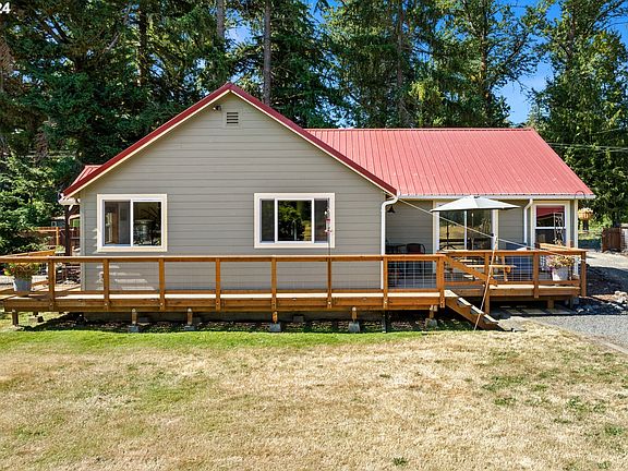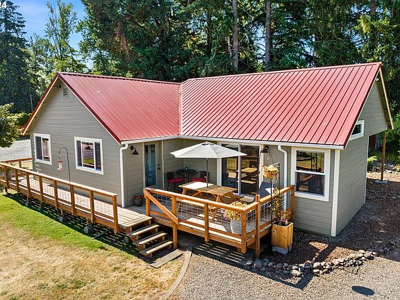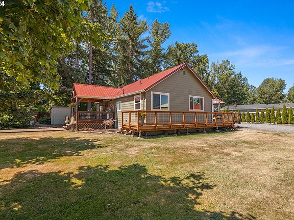 Discover Your Riverside Retreat! Nestled along the picturesque Molalla River, this one-of-a-kind home awaits you. Recently remodeled and move-in ready, it exudes charm and functionality. As you step onto the covered front porch and open the front door hardwood floors lead you into the dining room and living area. The open kitchen features vaulted ceilings, tile flooring, and stunning quartz countertops. Stainless steel appliances, a pantry, and direct access to the wrap-around deck make this space both practical and inviting. Two bedrooms offer versatility, one with hardwood floors and the other with wall-to-wall carpeting and a loft area. The living room, also vaulted, opens to the deck, creating a seamless indoor-outdoor flow. The seller has cleverly used the living room as a bedroom, with plans for a bathroom addition. Meanwhile, the dining room could be expanded for even more living space. For more information on what the future plans were, please ask your agent. Outside, the level 5.07-acre property is divided by the road. The home and outbuildings area are fully fenced and gated, ensuring privacy. Cedar fencing adds to the ambiance. Multiple outbuildings provide endless options. 36x48 shop with indoor RV parking, separate electric panel, concrete floor, and woodstove. An exterior covered RV parking pad with hookups. 26x36 barn featuring a loft and tack room, with its own electric panel. A 20x20 hobby room. Detached 2-car garage, fully finished with drywall, insulation, and paint, complete with 220 electrical for stove hook-up (previously used for canning). A chicken coop with fencing. Across the road, a riverfront studio cabin beckons. Imagine relaxing on the studio deck, listening to the Molalla River flow by. Whether you fish or simply cool off on hot summer days, this serene spot is your private year-round Zen oasis. Don't miss the opportunity to explore this captivating home and property. Additional photos are available via an attached link.
