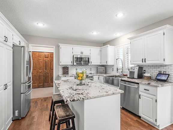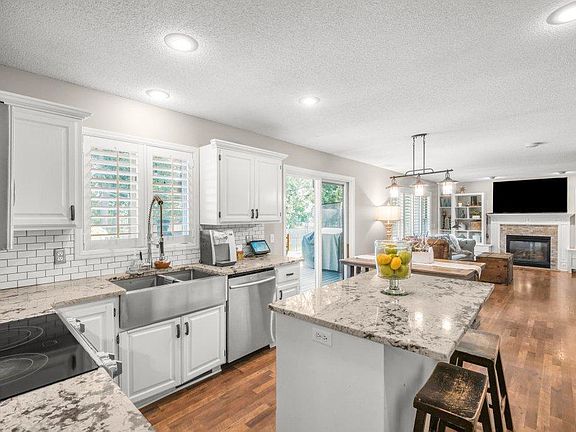 fireplace mantel, hardwood floors, SS appliances, and farmhouse sink. Updated trendy lighting throughout plus hidden perks like the upgraded garage openers for all your gadgets! The open layout offers functionality while also still allowing privacy and formality- perfect for everyday living and those special moments. The formal dining space can be used for dining, flex space, playroom, family room, etc. The garage has been well cared for with epoxy floors, finished and insulated walls, shiplap walls,