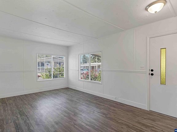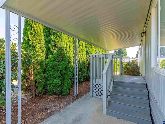 Light and bright house in peaceful 55+ park. All new vinyl flooring, interior & exterior paint, kitchen countertop & sink, tub surround, and electrical panel. Upgraded vinyl windows. Stove and fridge included. Gardeners’ paradise - large 0.1 acre lot with roses, rhododendron, and cedars. Enclosed patio 22’ x 7’ not included in home square footage. Partially fenced back yard. Garden shed. Parking for two cars. New driveway 40’x 8’. Space rent - $720 includes W/S.