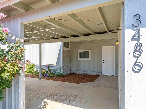 Light and bright house in peaceful 55+ park. Many updates! Lovely new vinyl flooring throughout, fresh interior paint, new exterior paint, new lighting throughout, upgraded vinyl windows, new electrical panel, new kitchen countertop and backsplash, range hood, sink, and faucet. Stainless glasstop stove and refrigerator included. New tub surround and faucets and fan in hall bath, updated toilet and sink vanity in master bath. New 40’ driveway. Gardeners’ paradise - large 0.1 acre lot with roses, rhododendron, hydrangea, clematis, and lush cedar trees. Covered patio 11’ x 9. Additional enclosed patio 22’ x 7’ not included in square footage of home. Partially fenced back yard. Garden shed is 9’ x 7’. Parking for two cars, one under carport and one behind in the driveway. Current property taxes are $0. Centrally located just off Highway 99E. Space rent of $720 includes water/sewer. Park pet limit: 1 20 pound dog or two indoor cats.