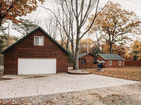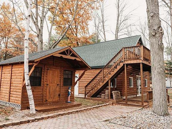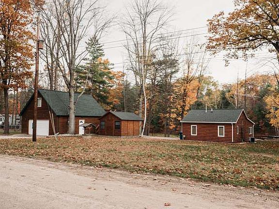 You will want to see this northern retreat! everything is in excellent condition and very well maintained, there is fresh stain on the decking and exterior of home, cabin, bunk house and garage. This can be sold basically turn key so just pack your bags and enjoy all the thousands of acres of state land until we get our lake back. The home is adorable and has a separate bonus 12x12 cabin that is sleeping quarters or a hang out. plus the loft above the garage that is finished into sleeping quarters also. Enjoy the bon fires on a circle paved slab, pavers with over 1,000 sq ft of decking from the cottage. This home includes 2 vacant lots across the road. Come take a look at this unique property with a 116 ft of board walk and nice seawall, garage has slider to go outside, pool table included and some tables and chairs in the garage.