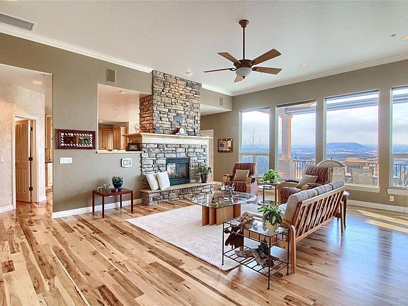 Incredible walk-out ranch w/ spectacular front range views from almost every room located at the pinnacle of Bell Mountain Ranch! Home features open floor concept w/hickory wood floors throughout common areas, NEW large Pella windows on main level, double sided fireplace connecting great room & gourmet kitchen w/knotty alder cabinets, stainless steel & panel-ready appliances, raised ceilings, custom niches throughout, main floor master & en-suite, 2nd main floor bedroom w/private en-suite, main floor office, two whole house fans, home wired with Cat5e cable, media room, secondary family & game room, 3 lower level bedrooms all w/private bathroom access & more. Retreat-esque outdoor living space w/amazing views is professionally landscaped, equipped w/ a fire pit, large entertainment deck w/ solar shade & tapped for gas grill, covered patio & approximately 33 trees throughout property to provide lovely foliage in the spring, summer & early fall months! *NEW Roof to be installed 3/2019*