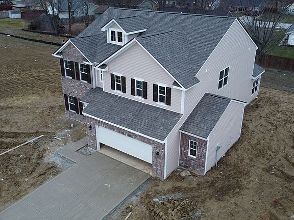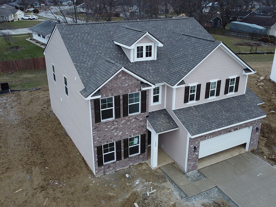 This 6-bed, 4-full bath Norway floorplan boasts an inviting exterior with vinyl and brick siding, vinyl shutters, and a two-car garage featuring a 6' side extension. garage entrance showcases a stylish square-paneled steel door with a keyless entry pad, 2 dusk-to-dawn coach lights, one on each side. To the left of the foyer is a separate dining room then leads into the open kitchen layout to the great room and breakfast room. Kitchen features a 7x6 pantry with wired shelving, center island with a 9'' deep stainless-steel sink, 42-inch-tall straight wall cabinets, small colonial crown, 4'' matching backsplash, and a cabinet above the refrigerator. The kitchen appliances include Frigidaire Stainless Steel electric range, microwave, and dishwasher. All kitchen and bathroom countertops are adorned with 2CM surfaces. Off the great room and nook is a spacious sunroom with connecting 12'x10' concrete patio. Frist floor has 9' first-floor walls and 5' tall windows. The bedroom on the first floor connects to one full bath room. A closet under the stairs provides additional storage. 5 bedrooms are located on the upper level where the loft has been converted into a 6th bedroom. The master bathroom boasts a 60'' shower, double sink, tall, elongated toilet, and a tub/shower combination with a bi-pass glass door. The second-floor bathrooms feature tall, elongated toilets and tub/shower combinations, with one having double sinks and the other a single vanity sink. All bathrooms include 35-inch-tall cabinets. The first-floor features vinyl plank flooring throughout, while the second floor is carpeted, with vinyl plank flooring in the laundry room. The laundry room is equipped with a shelf above the washer and dryer area. The entire house is finished with colonial trim. The heating and cooling system consists of an electric furnace and heat pump, with a digital thermostat and a 50-gallon electric water heater. The house is illuminated by energy-efficient LED lighting.