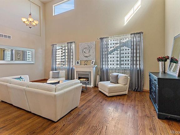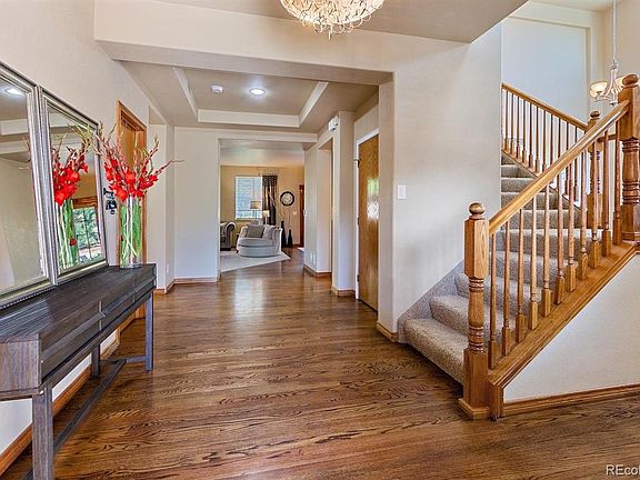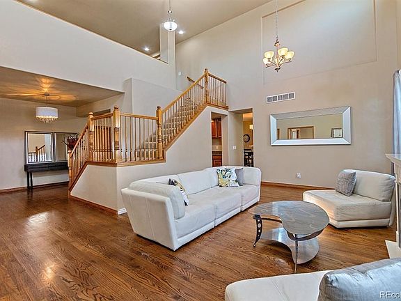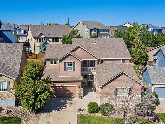 WELCOME HOME! Stunning 2 story open floor plan home located in the Terrain/Castle Oak Estates neighborhood- over 4700 SF finished! Rare 4 car garage (3 car tandem + 1 car side load) Upgraded hardwood floors in the living/dining room , kitchen, and foyer. The kitchen boasts granite counter tops with large island, custom cabinets, stainless steel appliances with double oven, and pantry. Main floor office has a private full bathroom. The large master suite has carpeting, plantation wood blinds, and large walk in closet. The 5 piece master bath has a shower and soaker tub with tile surround, and double vanity. The versatile loft overlooks the living room/dining room and has a private balcony. One upper level bedroom has a private bath with tile floors and tub surround, and walk in closet. The second floor bath has ample space and tile floors and tub surround. Lots of natural light beams through this home. The basement is professionally finished with a rec/theatre room, exercise/bedroom, additional bedroom with walk in closet, and full custom bathroom. The back yard has a rear concrete patio and a professionally landscaped yard with water feature that is perfect for relaxing or entertaining! East facing driveway/west facing back. Forced air heat, central air, fenced yard, and rear shed. This home will not disappoint! Minutes to downtown Castle Rock and all local amenities, and easy Tech Center commute.