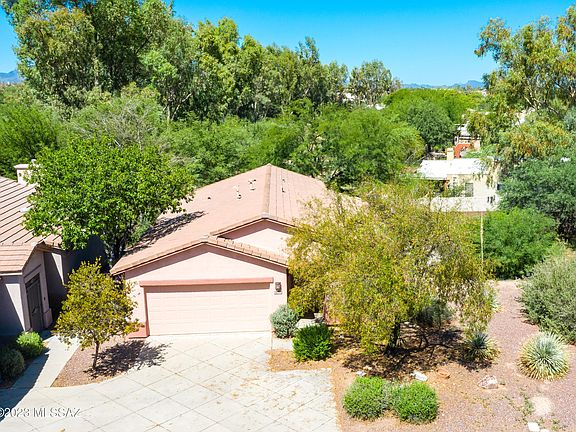 Privacy and views in this single-story 2-bed/2 bath home. Greenspace on north and west sides. Living room, dining area and eat-in kitchen present large north-facing windows, with Catalina views above the trees. Bird and pollinator friendly yard with irrigation system (installed 2022). Extra large master suite with walk-in closest and garden tub. Tile throughout. 2023 roof inspection and interior/exterior paint. Community provides gated access to The Loop trail along the Rillito River.