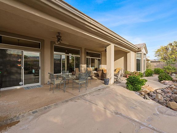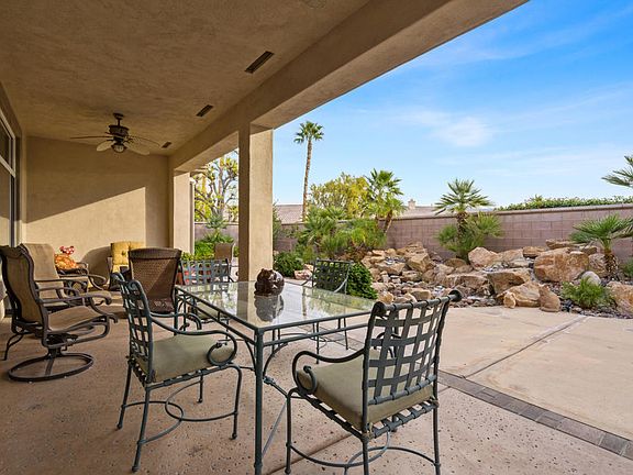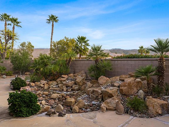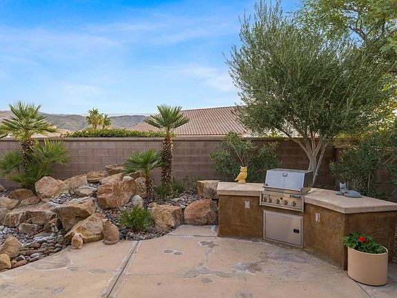 Sun City Palm Desert - Victoria. Located a short distance from the Lakeview Recreation Center, this exquisite greatroom home is upgraded inside and out. The east facing rear yard is elevated over the homes behind it providing views of the Shadow Mountains. The rear yard features a salt-finished patio with multiple sitting areas, a BBQ island and water feature. A gated front courtyard and leaded glass front door provides curb appeal. Furniture available outside of escrow. Inside, 10ft ceilings provide a light and open environment. Tile flooring is in all but the bedrooms & deb that are hardwood. The greatroom has a wood paneled media wall and a wall of windows looking out to the rear yard and mountains. The kitchen features granite counters & backsplash, a long breakfast bar, under cabinet lighting, cabinets with pullout shelves and stainless appliances. Double doors open from the main hallway to a den/office. The spacious primary suite has a bay window providing views of the mountains and huge walk-in closet with built-in storage. The primary suite bathroom has dual sinks, a sitting vanity, quartz counters, an oversized spa tub and a custom tile stall shower with rimless glass doors. The spacious guest suite has a walk-in closet and a shower/tub in its bathroom. The extended 2 car garage can accommodate a golf cart along with two cars. It has an epoxy floor and its own AC. There are 2 AC units for the living space. One new in 2018, the other 2012.