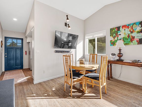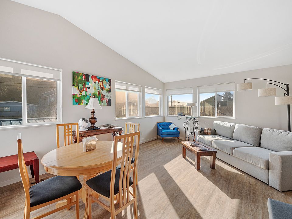 Your living space is open and spacious -- about 1000 square feet in total. The bedroom is large enough to sleep and to also have an "office." The living room is large and sunny. The home has a full kitchen and there is a laundry with washer / dryer within the master bedroom. The dining room contains a big dinner table with leaves that can sit up to 8 diner companions. The ceilings are in the bedroom and living room are vaulted, which makes everything feel very spacious. You can really spread out here, and it's the perfect space for two people working from home. There is also an optional two car garage if you need extra space for your beach toys or vehicles.