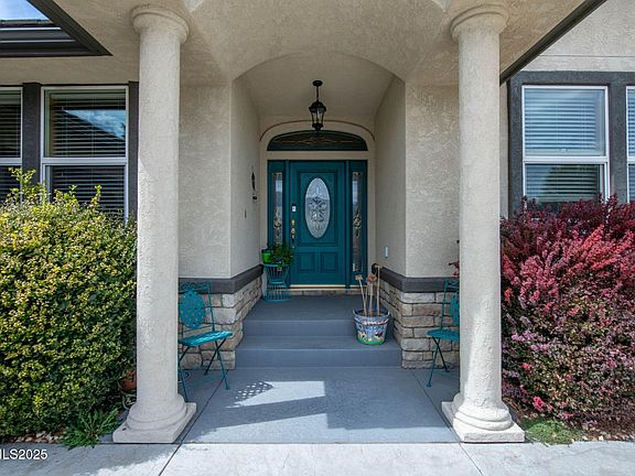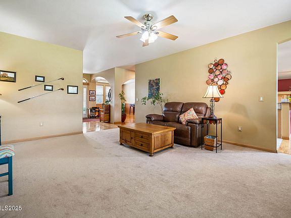 Beautiful Custom Home on the Fairway Welcome to this stunning custom home perfectly situated on the 15th fairway of the Dayton Valley Golf Course. Thoughtfully designed and meticulously maintained, this residence offers both elegance and comfort in every detail. Step inside to find a formal living and dining room, along with a warm and inviting family room featuring a cozy gas fireplace, built-in wine/liquor cabinet, and an entertainment center. The open kitchen is a chef's delight—boasting natural oak cabinetry, a pantry, granite slab counters, a center island with wine rack, 5 burner cooktop and includes the refrigerator. Hardwood floors flow beautifully through the foyer, hallway, office, dining room, family room, and breakfast nook, while tile flooring accents the kitchen, bathrooms, and laundry room. The spacious primary suite is a true retreat, complete with his and her walk-in closets with custom built-ins, a luxurious jetted tub, separate tile-surround shower, and block glass windows that provide both style and natural light. Natural wood door and window frames, custom draperies, and wood blinds add timeless character throughout.Additional highlights include a finished garage with a full wall of white storage cabinets, utility sink, and water softener. Outside, enjoy a charming tool shed and a raised-bed garden perfect for flowers or vegetables, all while soaking in the serene golf course and mountain views. This home blends refined finishes with practical features, making it a rare gem in the Dayton Valley Golf Course community.