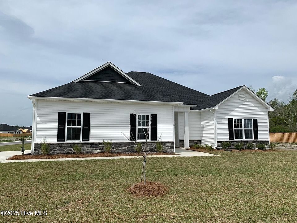 Welcome to the highly desired & popular community of Onslow Bay. Brand new construction built by Onslow County's most trusted & preferred builder, featured in Builder 100/ Top 200 Builders in the country. Onslow Bay is a hot spot, 3 miles to MCB Camp Lejeune's Piney Green gate, 14 miles to New River Air Station & minutes to area schools, shopping & dining. This beautiful neighborhood is sure to impress, complete with a clubhouse area & community pool. The Raegan is a Sydes exclusive floor plan, 1916 heated square feet, split floor plan with 3 bedrooms and 2 bathrooms. A quaint front porch welcomes you home into a magnificent 18x23 family room with a cozy corner fireplace. The master suite will feel like a private retreat, 17x13 with dual closets and a luxurious master bathroom. The master bath is a spacious 11x13 with double vanity, separate shower, and soaking tub. The kitchen is sure to impress with beautiful flat panel, staggered cabinets, and stainless-steel appliances to include smooth top range, dishwasher, and microwave. Eat-in kitchen is open to a 9x12 dining area. Bedrooms two and three have ideal walk-in closets. 2-car garage and a covered back porch. Call today. NOTE: Floor plan renderings are similar and solely representational. Measurements, elevations, and specs may vary in final construction. Limited selections for buyer to choose. Call L/A to verify.