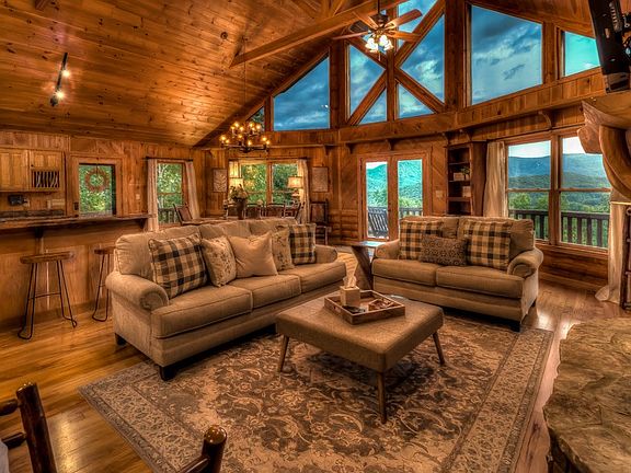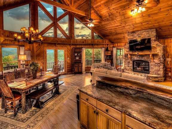 ^^^CHASING VIEWS^^Welcome to this exquisite 4-bedroom, 3-bathroom prow front home, offering breathtaking year-round views and an open floor plan designed to maximize natural light and space. Located in a gated community near the Cohutta Wilderness area, this fully furnished and tastefully decorated home is being sold turnkey. The main level features a wall of windows facing the expansive mountain views, a spacious living area with a stacked stone fireplace, and a gourmet kitchen with custom cabinets and marble countertops. Two spacious bedrooms and convenient laundry facilities are also located on the main level. The luxurious master suite boasts cathedral ceilings, a walk-in closet, and an ensuite bathroom with a jetted tub, double vanities, and granite countertops. The terrace level includes a large open entertainment/game room, a wet bar, and a wine cooler, with expansive windows overlooking the stunning mountain view. Outdoor living is enhanced with two levels of porches facing the view, a cozy screened in porch with with real wood burning fireplace ,a brand new hot tub, and a fire pit area. Additional features include proximity to the Cohutta Wilderness area, offering endless outdoor activities and adventures. Also just a quick drive to downtown Blue Ridge! Don't miss the opportunity to own this remarkable mountain retreat!