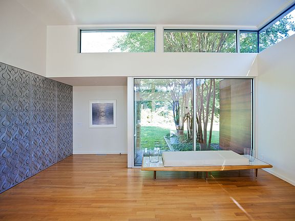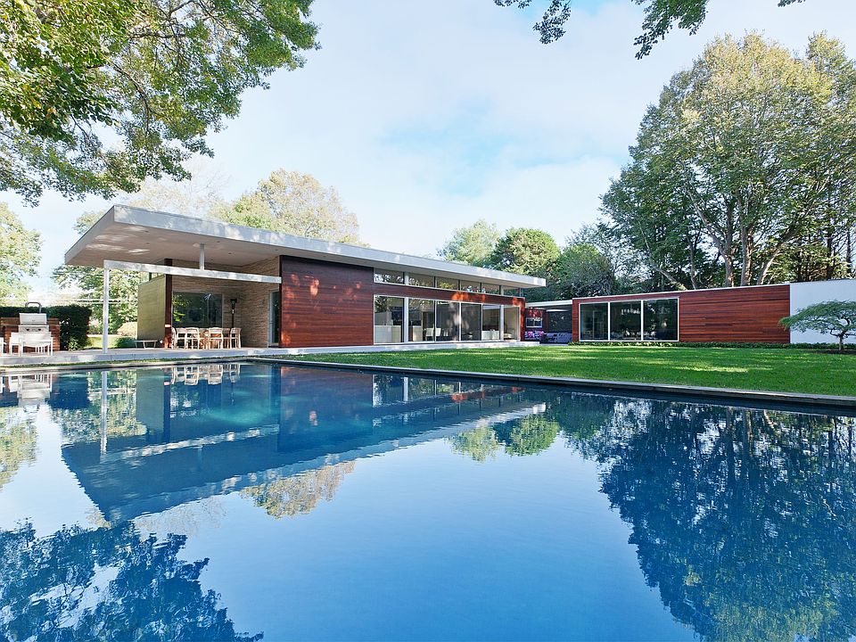This exquisitely crafted California Mid-Century Modern style home is of a caliber rarely found and attainable at this price point in a desired south of the highway location. Designed for easy one level living and entertaining, there is an effortless integration of the loft like public living areas with the serene private spaces. The open floor plan kitchen, dining and living areas have walls of windows that flood the interior with light and provide views of the landscape in a convergence of indoor and outdoor. Transom windows throughout frame the greenery while making the ceiling appear to float above. The master suite occupies one wing of the main house while three guest bedrooms are separately situated for privacy. Indoor and outdoor living spaces abound, including the sizable den/media room, outdoor dining area beneath the cantilevered roof, and a mahogany porch with automatic screens and stadium style seating. In the newly completed pool/guest house, there is a large open plan living, dining and kitchenette area as well as two spacious rooms, a full double-sink bathroom and additional laundry facility. The property is gated and graced with lovely landscaping, ample lawn, mature trees, gunite pool, built in BBQ and Boffi outdoor shower. Minutes to Flying Point Beach, Mecox Bay, farmstands, Parrish Art Museum and town.