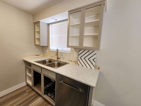 Gorgeous brand new and completely remodeled (10/2025) garden level 2 bd in four-plex with new everything! Giant living room, semi formal dining (with cool chandelier), dishwasher, and lots of cupboards! Two tone paint, CENTRAL air, hook-ups, new luxury vinyl tile flooring, Covered parking & extra storage available.
