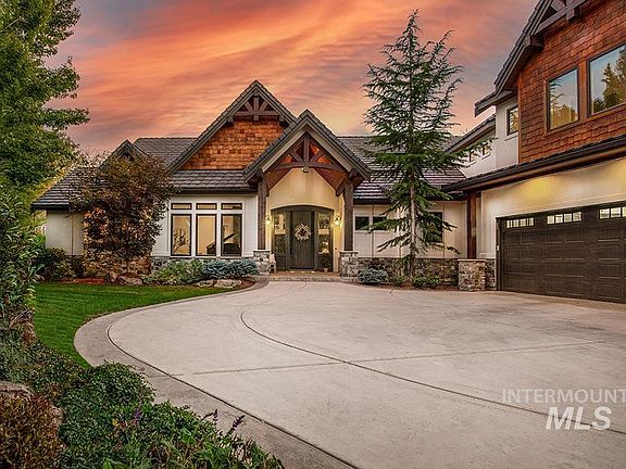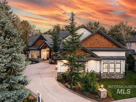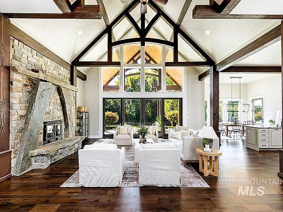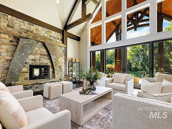 An irreplaceable riverside retreat that celebrates Idaho's beauty! Clinging to a bend along the Boise River in one of Eagle's premier neighborhoods, this one-of-a-kind property enjoys 119' of water frontage surrounded by what feels like uncharted territory. Building within city limits rarely offers opportunity for seclusion... this is an exception. Competing in beauty with the environment, its rugged, yet unmistakably refined architecture rivals mountain resorts found in Jackson Hole or Sun Valley. The entrance is a voluminous sweep of open living, dining, and kitchen, while awakening cathedral ceilings and a floor-to-ceiling wall of windows add an airy weightlessness. The crackling native stone fireplace beckons in the great room, as riverfront views set the backdrop and dual sliding glass doors open the home to an ever-evolving nature show. The gourmet kitchen meets the best of form and function with an impressive appliance package, knotty wood cabinetry, and designer finishes.
