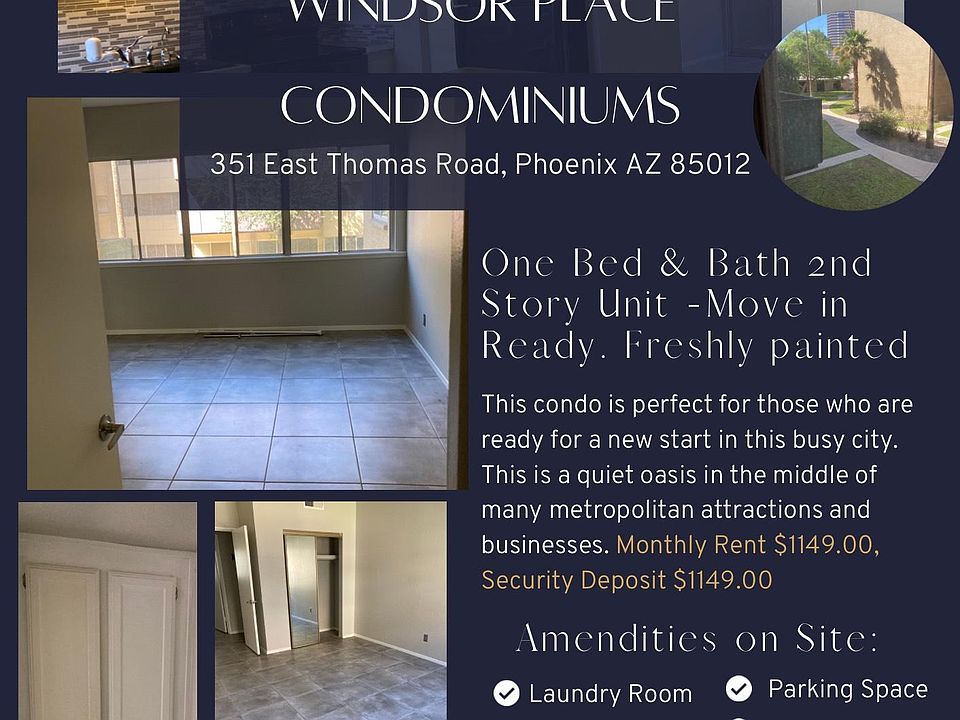 Freshly painted 1 bedroom i bathroom condo with tile flooring, newly renovated bathroomLocated within Windsor Place Condominiums (5th St & E Thomas Rd. Gated community with two pools, Owner pays for electricity, water, sewer, HOA fees etc.
