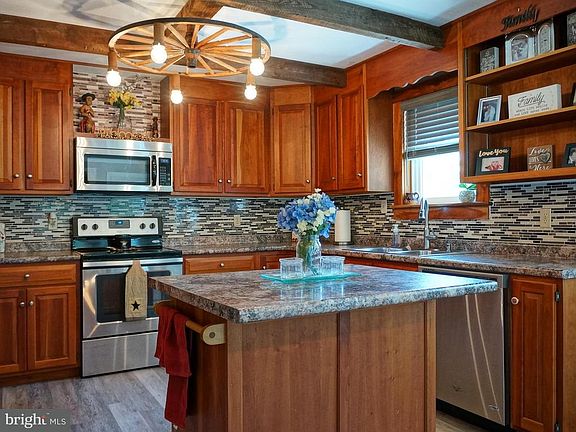 Unique rancher that was formerly a 3 bedroom home and could easily be converted back if needed. Situated on 9 acres of private tranquility await with abundant wildlife, creek, small orchard and plenty of updates make this one hard to resist! The roof, siding, HVAC, windows, kitchen, bath and floors has been updated. You'll enjoy a bit of nostalgia too including authentic stone chimney, handcrafted wooden doors with antique locks, chestnut ceiling beams, locally made cherry cabinets and a foyer coat rack crafted from a church organ piece! In the full walk-out basement there's also a wood stove to help with heating cost and plenty of firewood available. All appliances are stainless steel and convey making this a truly move in ready piece of paradise. BE SURE TO SEE OR ASK FOR A COMPLETE LIST OF IMPROVEMENTS TO THIS HOME and schedule your private showing today!