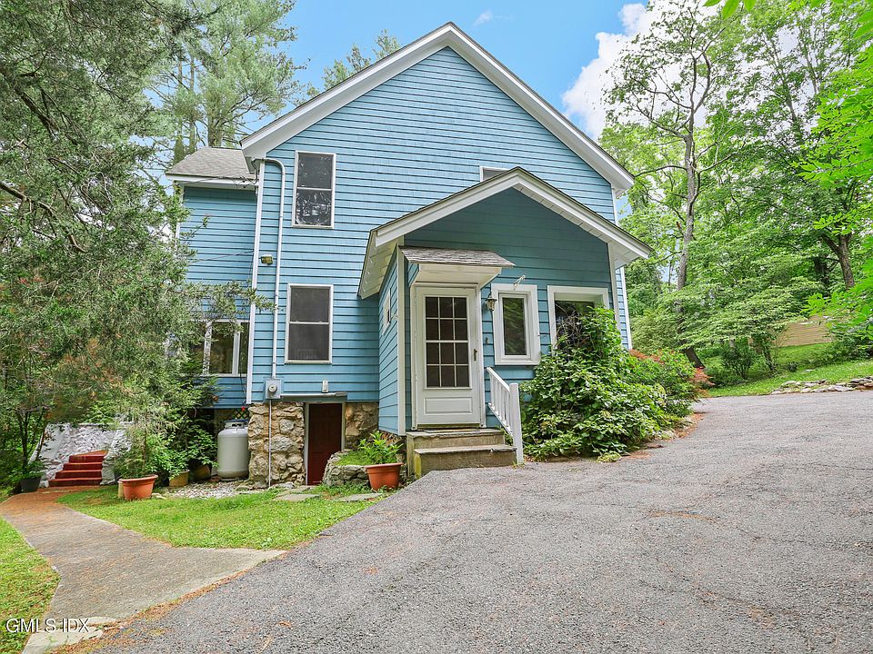 Light-filled four-bedroom Colonial with expansive deck and 2021 renovated kitchen sits atop two private acres at the end of long, shared driveway with a charming bridge spanning Byram River. Spacious interior boasts hardwood floors and high ceilings. Generous entry way unfolds into an open plan living room and dining room with stone fireplace; office; family room and chef's eat-in kitchen outfitted with stainless appliances. Sundrenched double height stairwell leads to second floor anchored by master suite with picture window framing wonderful tree top views, walk-in closet and bath. Three comfortable bedrooms and full bath round out this level. Offers abundant storage in pull down attic; two detached garages with parking for three cars and children's fort/tree house. Very low taxes.