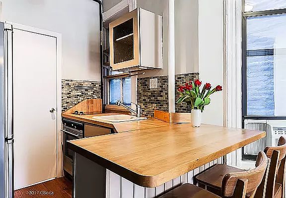 The best deal on West Broadway! Located in the heart of Soho just below Broome, this pre-war studio is surrounded by the city's best restaurants and shopping. The apartment has six windows and 9' 6" ceilings creating an airy, light-filled space. Views are to the East and North and are on the quiet, private side of the building. The apartment has hardwood walnut floors throughout, and top quality finishings, such as Ann Sachs bathroom tiles, Kohler fixtures, Toto toilet; John Boos butcher block kitchen counter, dishwasher and a full size refrigerator. Above the kitchen counter is a pull down home theater projector screen for TV, movie and sports entertainment.
