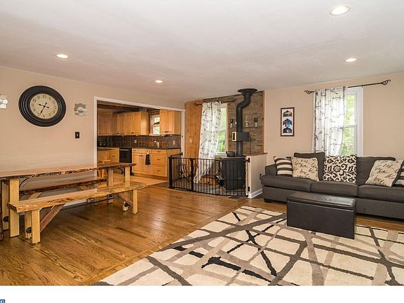 Great opportunity to own this 2000 SQUARE FOOT single family home on over 1/2 an acre with a large 2 car detached garage. This lovely home boasts a convenient and flexible floor plan! Enter the spacious living room with hardwood floors and wood burning stove which opens to the grand kitchen. The kitchen features an island, newer dishwasher, lots of cabinets and tons of counter space. Ceramic tile back splash and ceramic tile all enhance the maple cabinets. On the first floor there are 2 rooms off the living room and there are 2 additional rooms in the back of the home off the kitchen. There are 2 sliding doors for your convenience to access the enormous 30'x 15' wrap around deck. For those cold days you can warm up next to the wood burning stove, or on the hot days cool off with central air conditioning. Upstairs is a sprawling master bedroom fit for a King or Queen. Measuring approx 23' x 15', the bedroom has doors to an upstairs deck, Skylights, 2 ceiling fans, and it's own built in central air unit. Large walk in closet and remodeled full bath en suite with ceramic tile and Corian countertop vanity. The hall bathroom on the 1st floor has recently been upgraded and newer Bilco doors in basement. Newer Micro mound septic system which does not require to be pumped. Newer HVAC and newer hot water heater have also recently been upgraded. Also included is a UV Water Treatment system. Wired security system on exterior of home does not require monthly subscription. 06/15/17