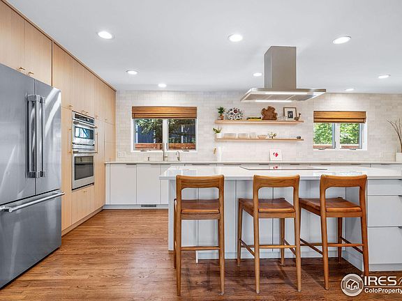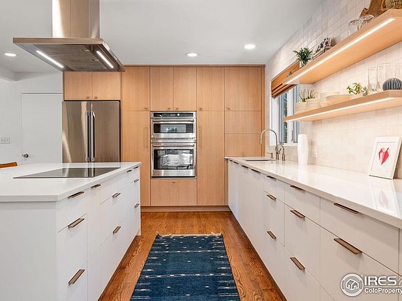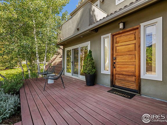 Welcome to 3490 16th St, a fully renovated gem on a corner lot in the desirable Melody Heights area of Central/North Boulder. This home is positioned on a quiet cul-de-sac and offers an open flow with distinct, separate spaces that provide a sunny and bright atmosphere. The southern sun streams into the home, highlighting the warmth and charm throughout. Enjoy the scenic views of South Boulder Peak, Bear Peak, and the Flatirons from your private balcony off the primary suite. The inviting front porch and back decks are complemented by a new modern horizontal fence and new low-water native plant landscaping with a dry riverbed, blooming from spring into fall. The outdoor space is designed for entertaining, featuring a gas hook-up for the grill - no propane tanks needed, and a hot tub surrounded by mature trees for privacy. The home boasts a spacious designer kitchen with a 36" Thermador induction stove, Cafe double wall oven, instant hot water, and an eat-in kitchen nook. The elegance continues with oak flooring throughout the main and upper levels, while the basement offers a spacious rec room with space for foosball or ping pong, additional storage, and cozy carpeting. Modern updates include a new air conditioner and furnace (five years old), a furnace humidifier to maintain comfort during the winter, and a minisplit in the primary suite for energy efficiency. The home also features three beautifully remodeled bathrooms, one on each level. Convenience is at your doorstep with a two-car garage and a prime location just one block from the bike path to NBRC and downtown. Two nearby parks, Melody and Catalpa, add to the neighborhood's appeal. This home is a rare find in Boulder, blending modern elegance with the comfort of a welcoming sanctuary.